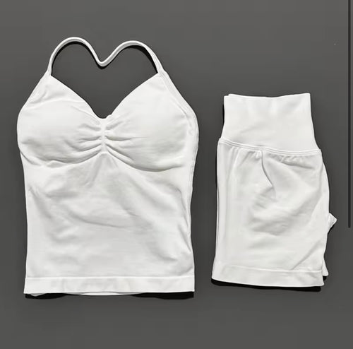 2 Piece Histello Sports Set Women Longline Strappy Top Seamless Yoga Tank Scrunch Butt Workout Shorts Suit Gym Sports Sets